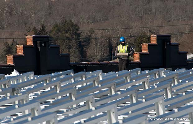 At the Seaport, Wilson says the museum worked closely with the town of Stonington to address any historic preservation concerns. The main issue was whether or not the panels could be seen. In this case, it was not a problem because the building still had an original brick parapet shielding the panels from view.