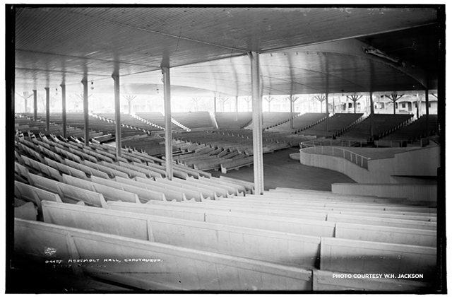 At the institution’s center is the 1893 Chautauqua Amphitheater, a 4,000-seat, roofed, open air structure internationally recognized as a forum for American culture and history. Its wooden stage has hosted Franklin D. Roosevelt, Susan B. Anthony, Thurgood Marshall, Bobby Kennedy, Ella Fitzgerald, Amelia Earhart, Booker T. Washington, Bill and Hilary Clinton, and Sandra Day O’Connor, to name just a few.